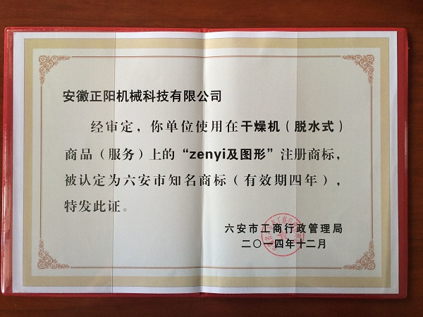 “zenyi”牌干燥機(jī)(脫水式)商標(biāo)榮獲六安市知名商標(biāo)稱(chēng)號(hào)